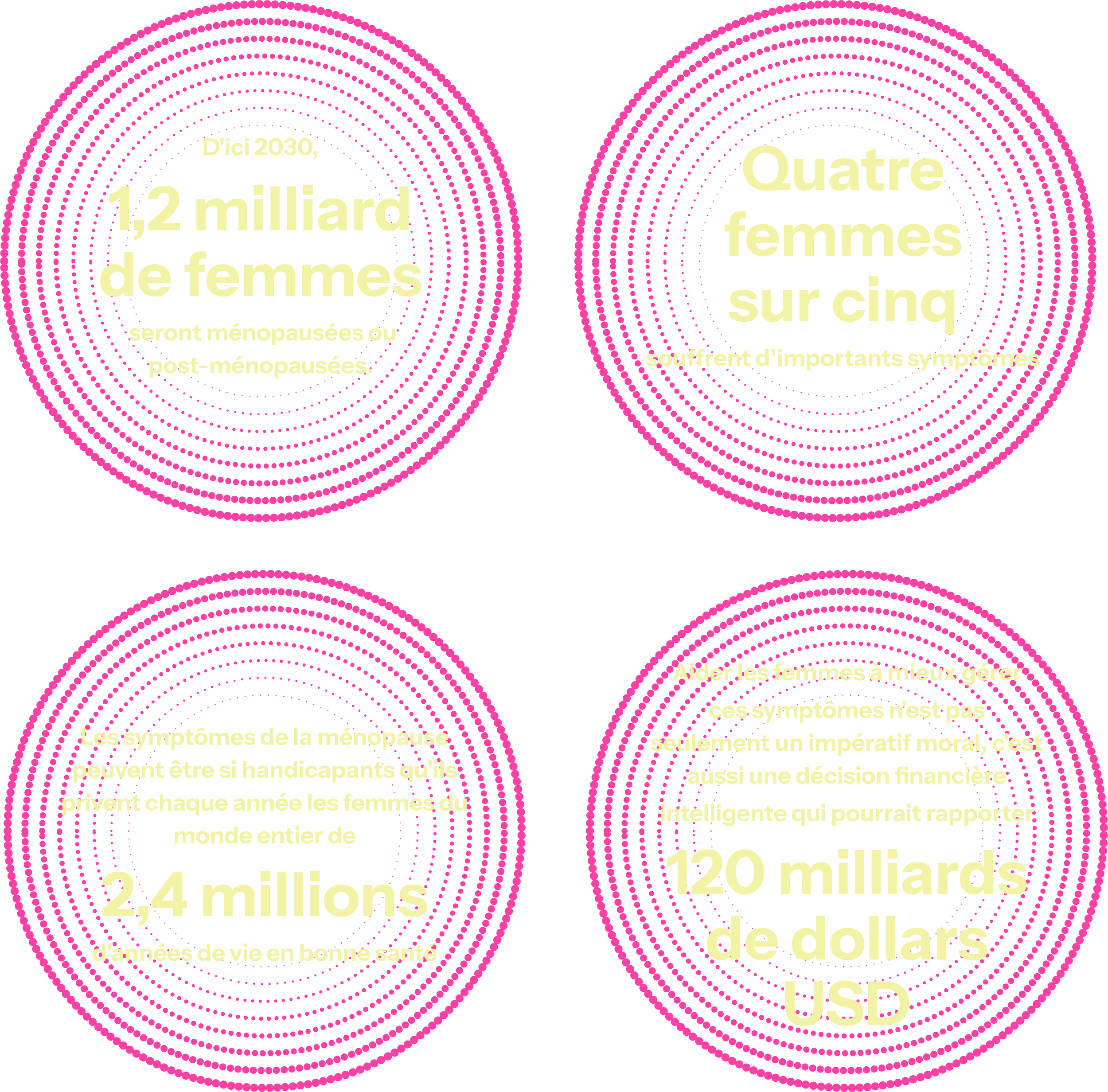 Mais nous avons le pouvoir de changer les choses. Aider les femmes à mieux gérer ces symptômes n'est pas seulement un impératif moral, c'est aussi une décision financière intelligente qui pourrait rapporter 120 milliards de dollars USD. (xix)